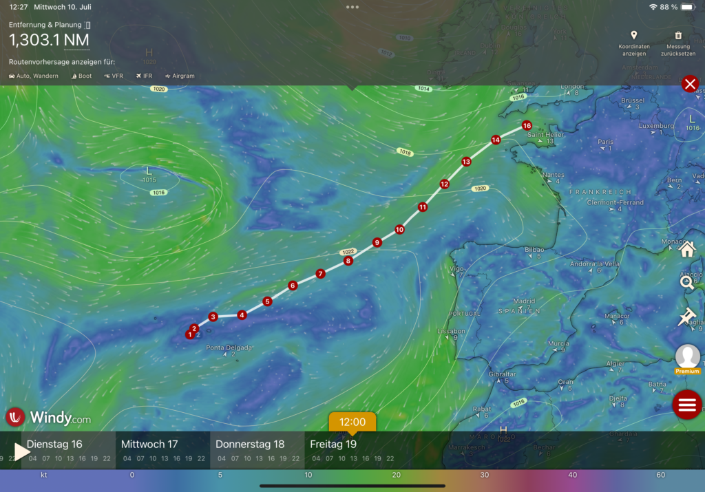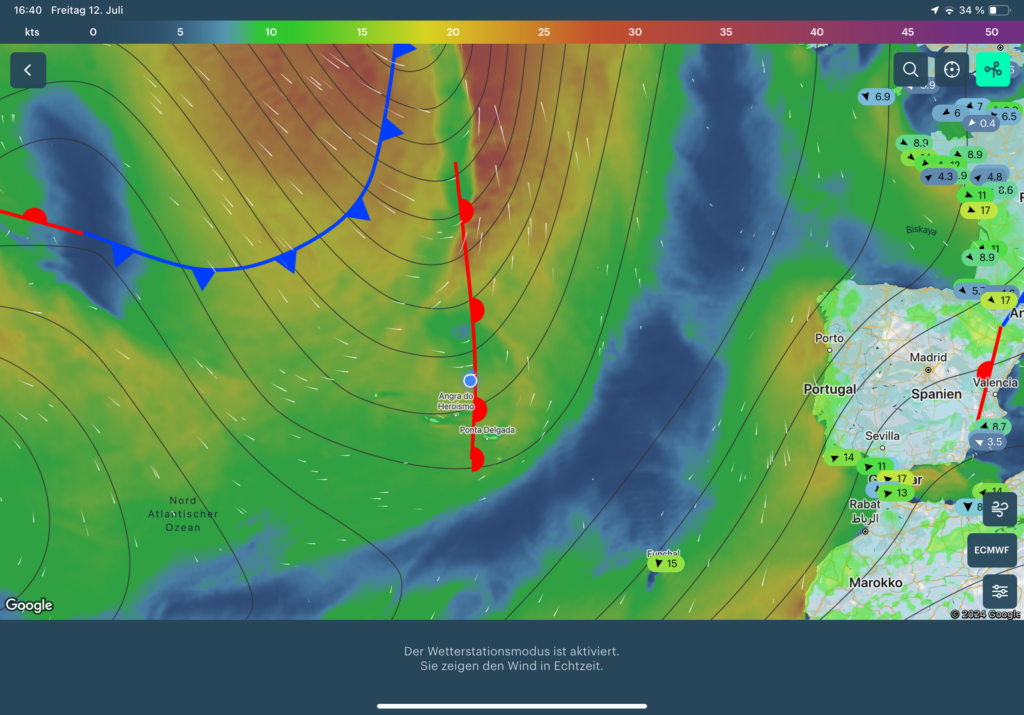 16.07.2024 Die letzten 2 Tage waren wieder extrem: von wenig Wind bis 9 kn und viel Wind bis 26 kn. Die europäische Wettervorhersage ECMWF ist ab dem Bereich „frischer Wind“ sehr unzuverlässig in Bezug auf Windstärke, Dauer und Wellenhöhe. Ab eine gemeldeten Wind von 18 kn, addiere ich 6 kn und für die Dauer 4 Stunden hinzu.