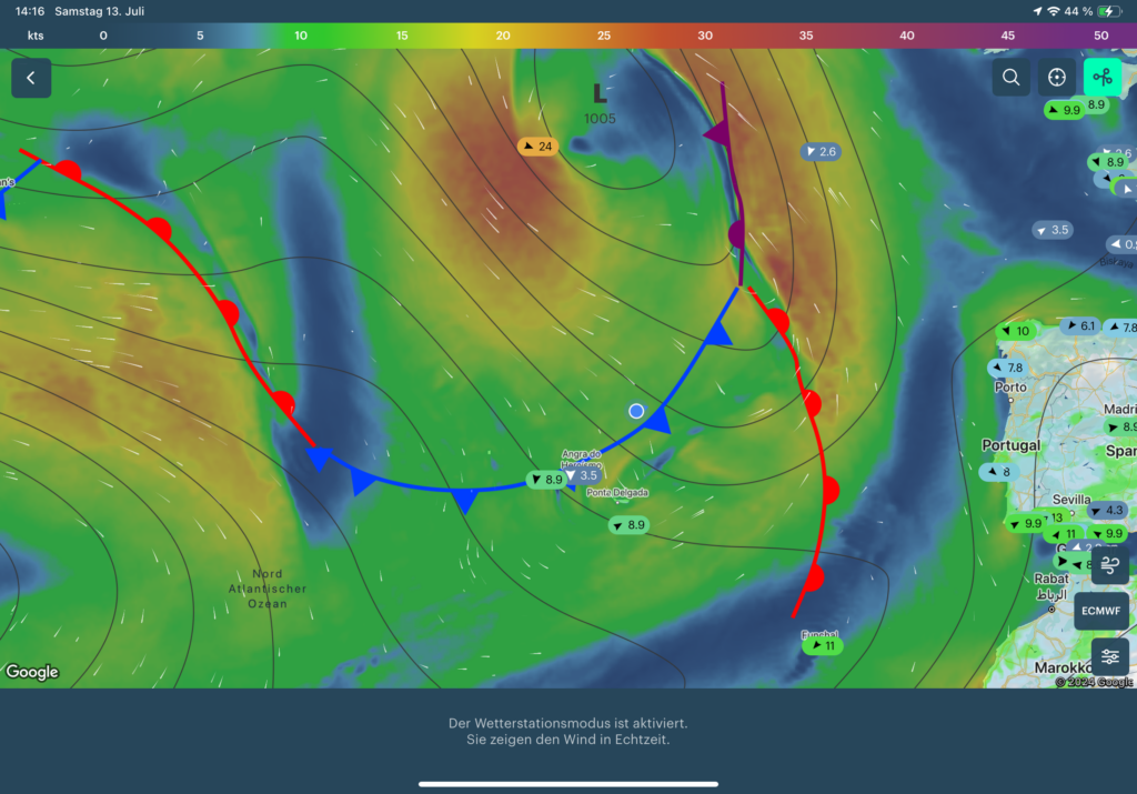 13.07.2024 Die Warmfront ist mit ihrem Durchzug seit letzter Nacht präsent: Wind in Böen bis zu 25 kn und heftigster Niederschlag. Die Temperatur liegt bei 21 °C und die Luftfeuchtigkeit bei 90 %. Um 10 Uhr kam die Sonne durch, die Wolken verschwanden und der Wind pendelte sich auf 14 – 18 kn ein und die Kaltfront zog unbemerkt vorbei.