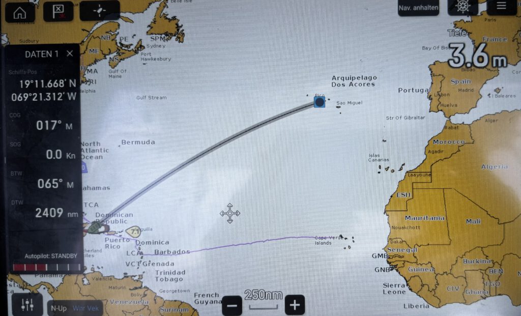 06.06.2024 Beim letzten Shopping auf DomRep habe ich eine halbe Staude grüner Bananen gekauft. Heute habe ich die erste gegessen. Diese war nicht so saftig und hatte bei weitem nicht den Geschmack wie die Chiquita von Hause. Letzte Nacht um 23:00 Uhr kam Wind auf, Segel gesetzt und Maschine aus. Seitdem segle ich mit beständigem Wind aus O, SO.